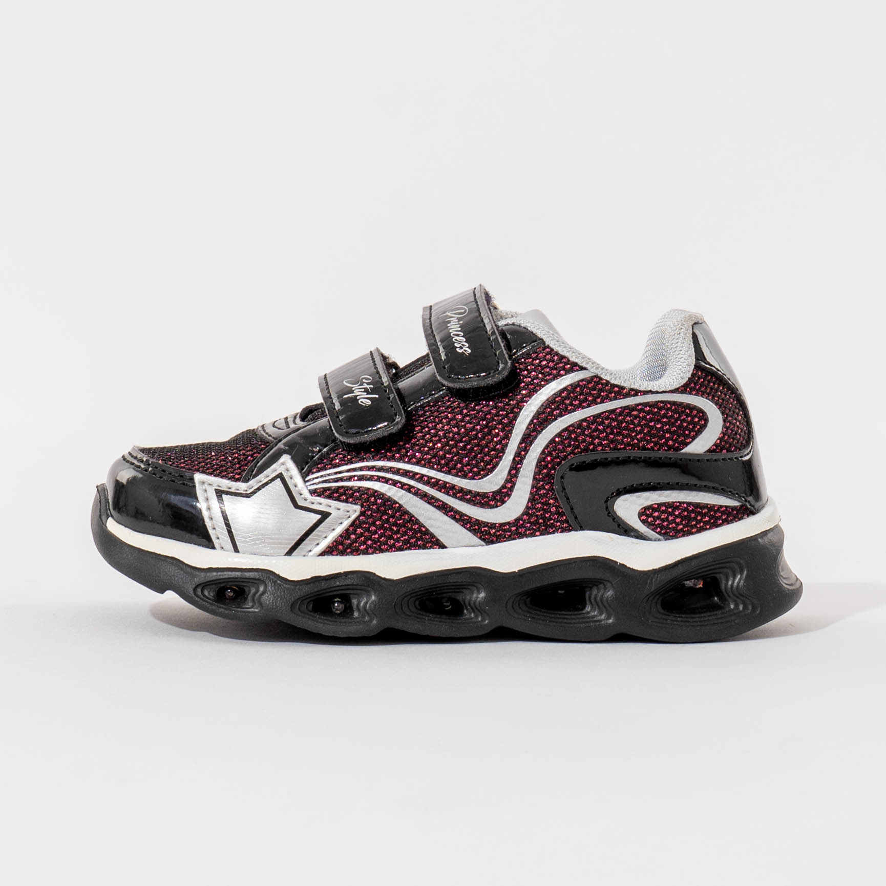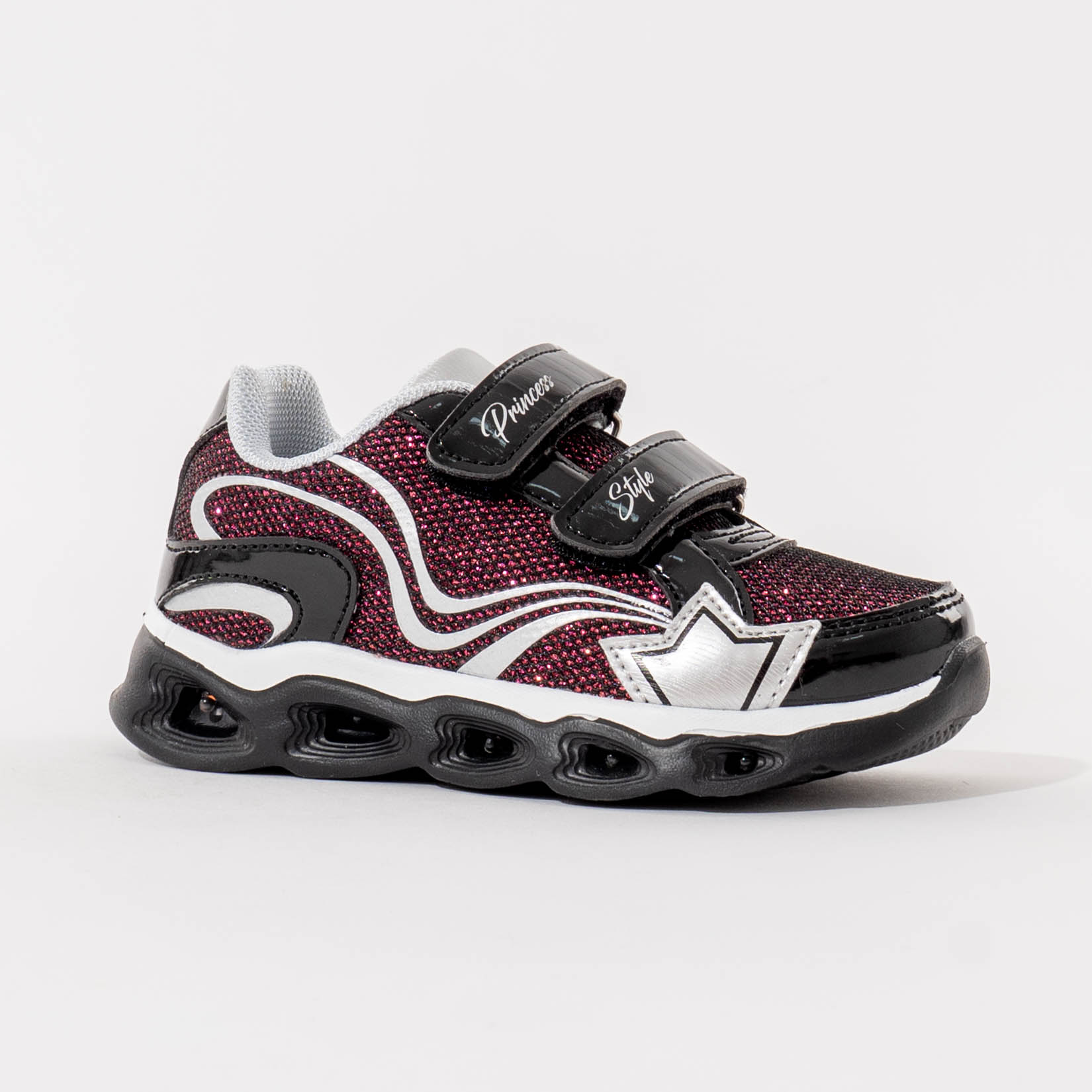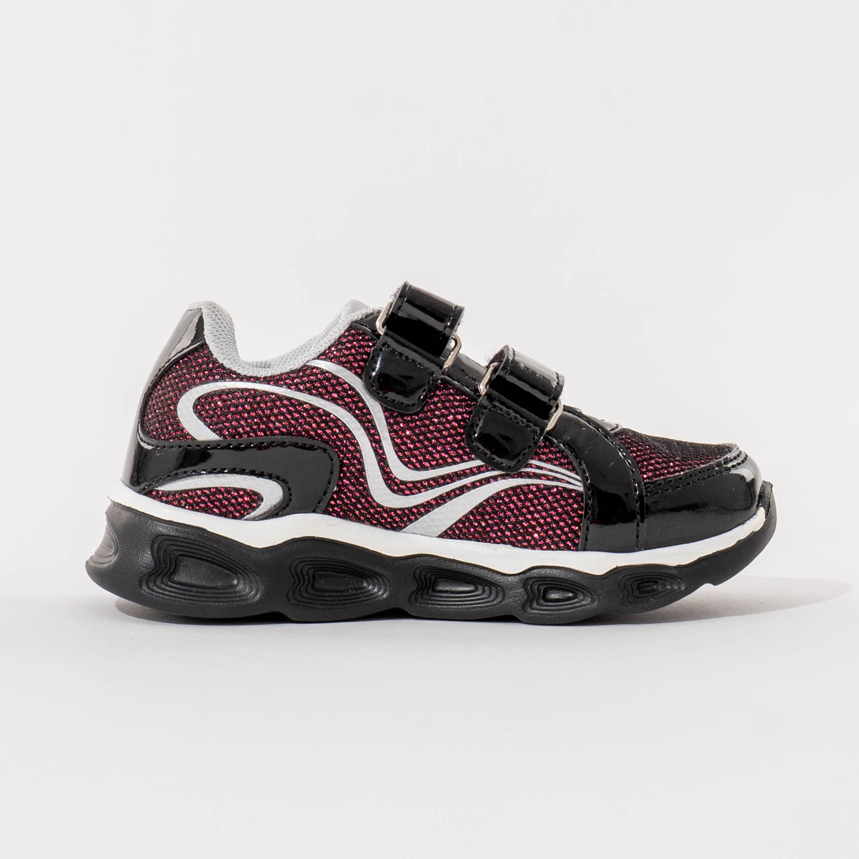 Gornji dio izrađen je od prozračnog materijala sa svjetlucavim efektom, dok lakirani detalji dodatno naglašavaju njihov moderan izgled. Dva praktična čičak zatvarača omogućavaju brzo i jednostavno obuvanje, kao i dobro prilagođavanje dječijem stopalu.